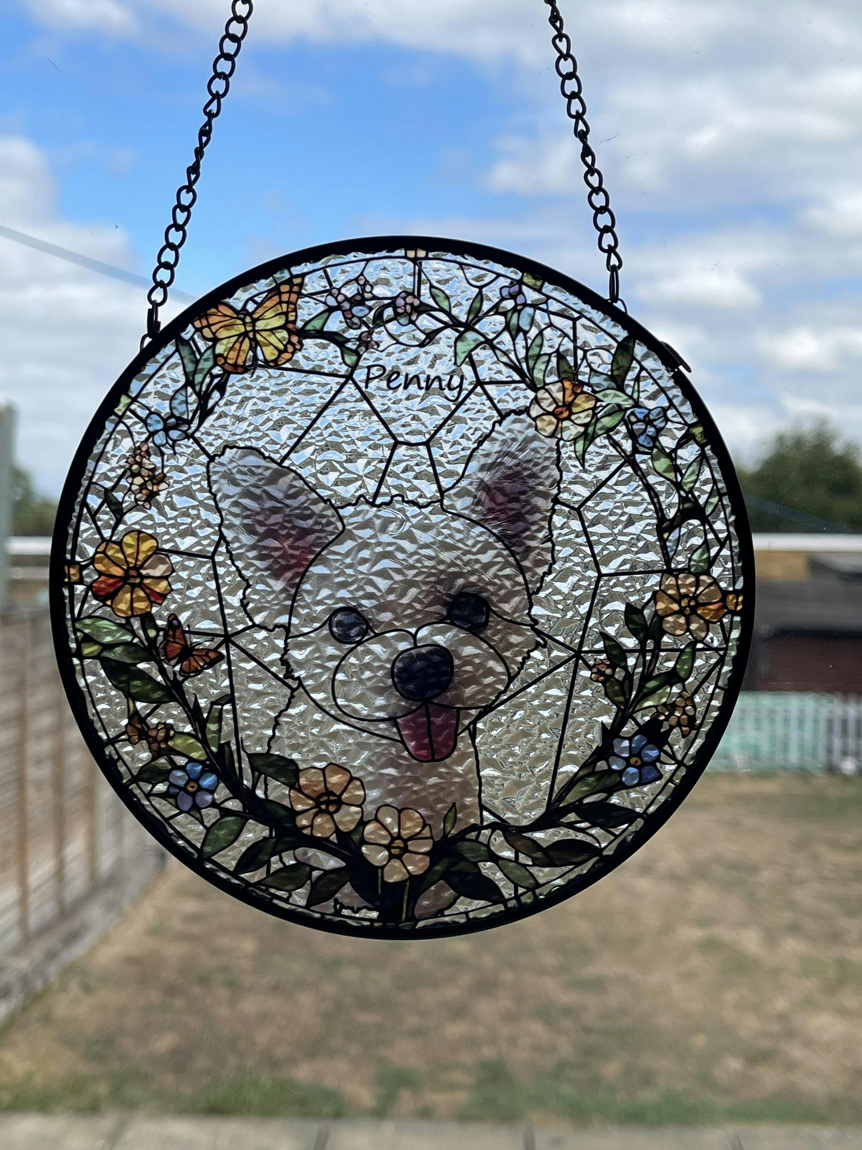 Cherish the memory of your beloved pet with our Custom Pet Portrait Stained Glass Suncatcher, designed to capture your pet's unique charm 🌈. This suncatcher serves as a heartfelt pet memorial or a thoughtful sympathy gift, adding beauty to any space, indoors or outdoors.
